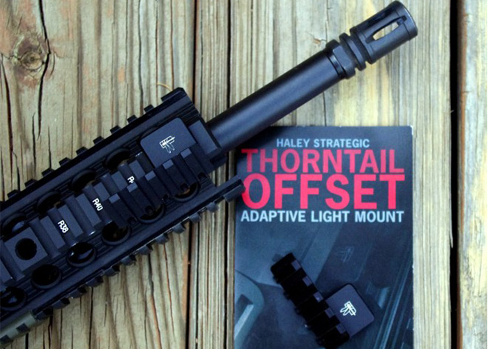 Here's a review of the HSP Thorntail Offset Light Mount, the product which we are interested in, especially the KeyMod version... "The Thorntail Offset mount was launched by Haley Strategic in October of 2012. The Thorntail Offset mount is a canted section of picatinny rail that attaches to a MIL-STD-1913 rail.