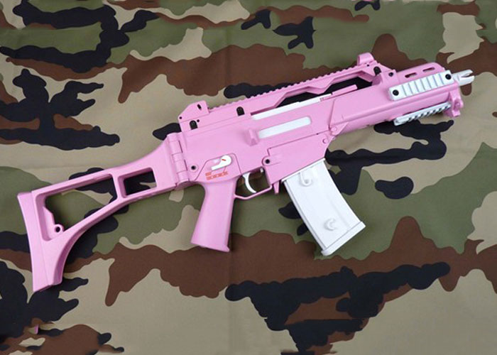 The contender for the best pink airsoft gun crown from the Femme Fatale M4 is this G36 Hot Pink from Umarex which is in stock right now at Action Hobbies and which you can
