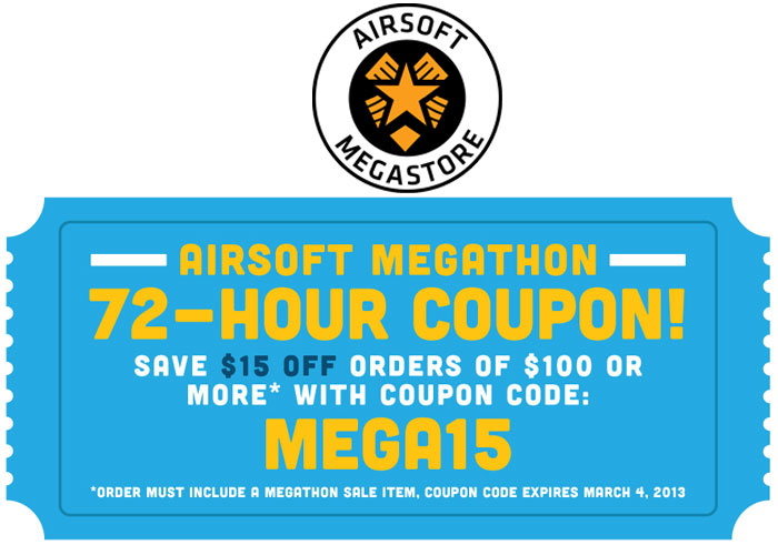 The latest update on Airsoft Megastore's Airsoft Megathon Promo... "Today is the final day of our Airsoft Megathon Sale and this also means that our final 72 hour coupon is going to expire soon too. You have one more day to get $15 off orders over $100 or more.