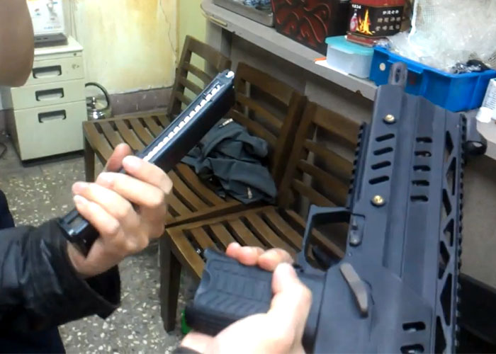 We're still having second thoughts on the design of the WE SMG-8 gas blowback SMG, which we call the mutant version of the H&K MP7A1. Anyway, whilst we're pondering on the design, here's Public Enemy gettin the scoop of of it being test fired.