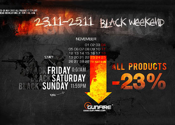 In Europe, it's Gunfire leading the charge for a weekend of discounts for airsoft players... "The earth will shake and so will your wallet! A mind-blowing promotion starts this Friday 23th. No tricks, no codes, total exposure – ALL products discounted at 23%.