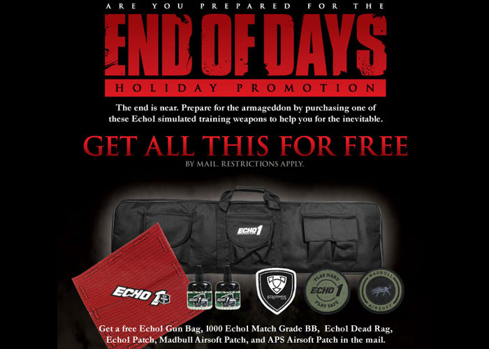 New promo from Echo1 USA that gives you a bunch of stuff when you purchase any of their products provided in the list below... "The End of Days is slowly approaching. Echo1 has the goods to prepare you for the armageddon.