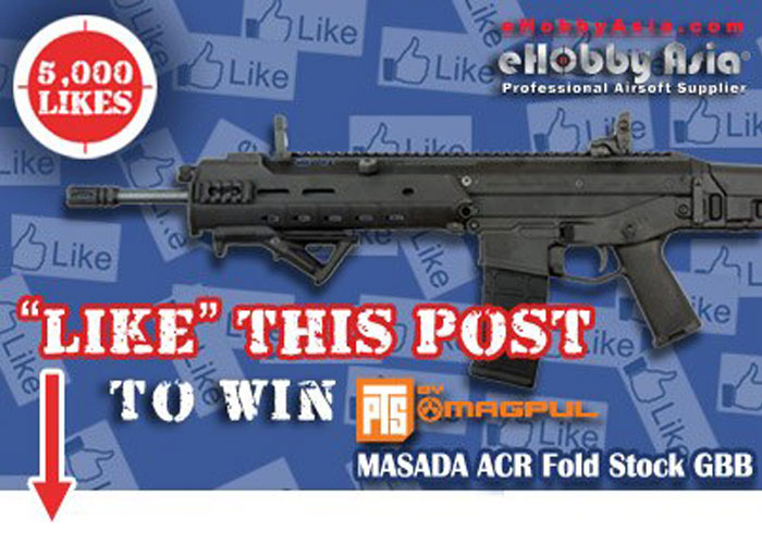 You want a Magpul PTS ACR Folding Stock Gas Blowback Rifle for free? If yes, then better like the wallpost of eHobby Asia as they will draw from those 5,000 likes... Simply login to your Facebook account and 'Like' our post featuring the '5,000 Likes' icon.