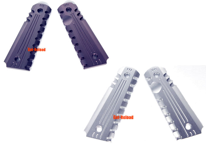 Two aluminium pistol grip covers made by Fatman now in stock at Get Reload. These will fit the Tokyo Marui 1911 MEU gas blowback airsoft pistols and may just also be fit with those other brands that are compatible with the Tokyo Marui one.