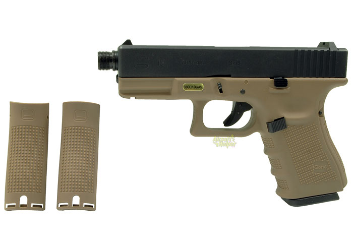 The Gen4 2-Tone (Tan) Glock 19 Gas Blowback Pistol from WE is at Airsoft Helper for US$78.47. This has a full metal slide with the slide engraved with Glock 19 markings.
