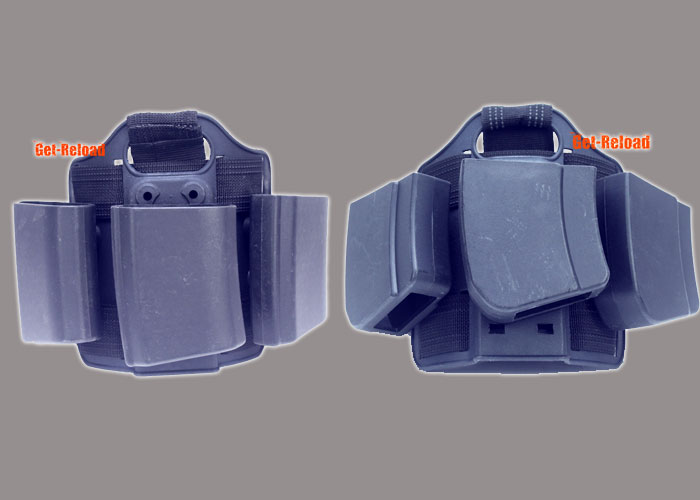 These triple dropleg magazine holsters for AK and M4/M16/AUG magazines are made of high density plastic construction with large buckles for making quick releases or buckle of the leg harness. They also have mounting holse for optional accessories.