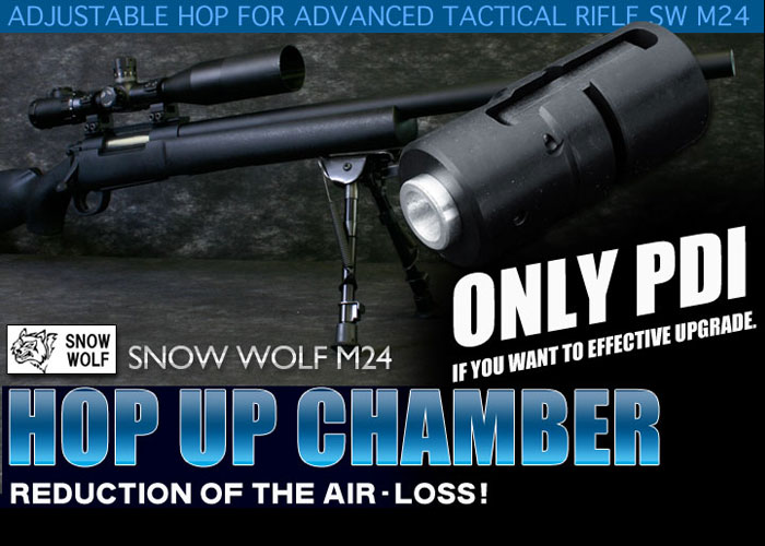 PDI Japan have taken a liking for the Snow Wolf M24 Sniper Rifle that they actually made a hop-up chamber for it at comes with 2 hop-up adjustable bars for easy adjustments.