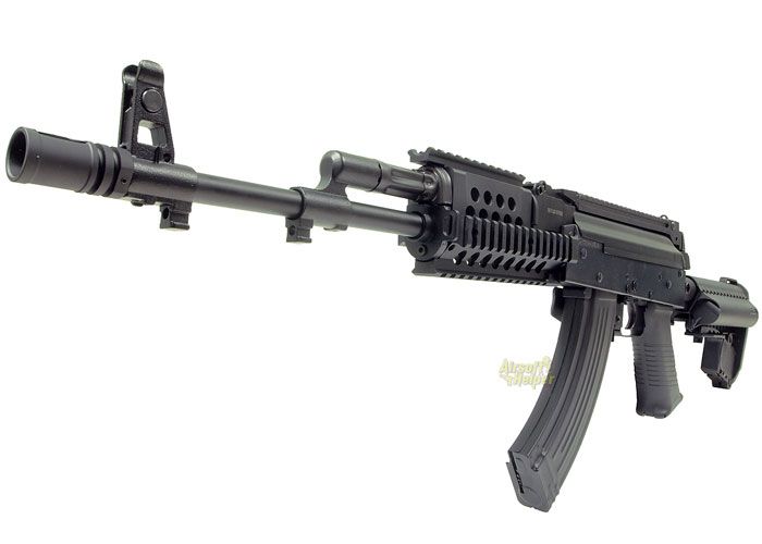 This modified AK AEG rifle from Classic Army is a Krebs Custom airsoft version which comes with CNC Rail Handguard that is made to fit AK rifles, enhanced Carbine VLTOR-style Modstock where you can load the battery, a rail mount base with rear sight, and Krebs Custom markings with its own unique serial number.