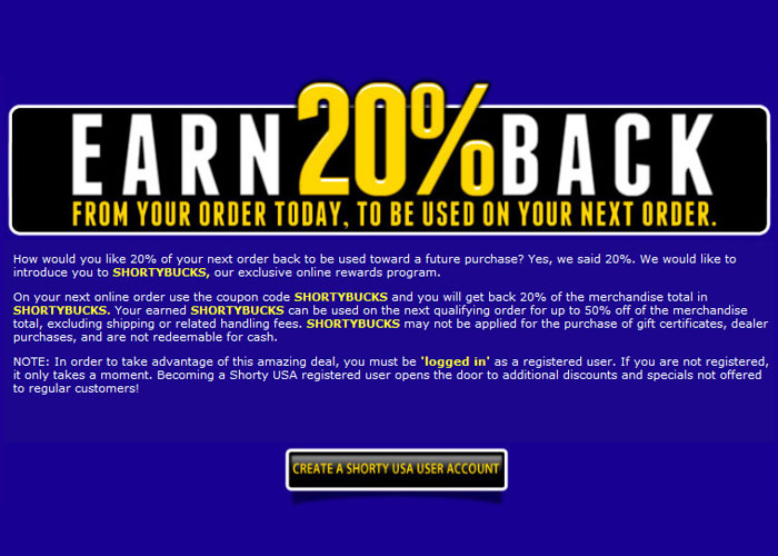 As we search for the best value for your money promos online, we have found this Shorty USA Shortybucks promo that you may like whch can give you up to 20%...