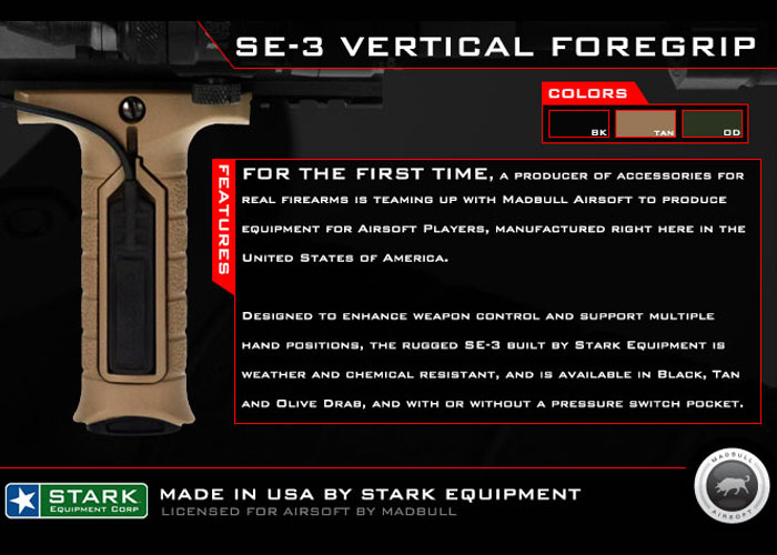 New release from MadBull Airsoft... "The SE-3 Vertical Foregrip has been designed to enhance weapon control, reinforce accurate shooting form and support multiple hand positions. The SE-3 attaches easily and securely to tactical rail systems.
