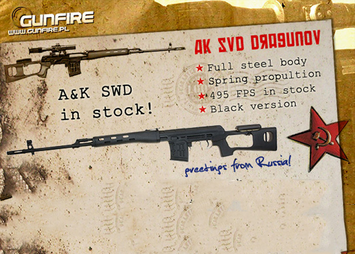 Gunfire Poland now has the SVD Dragunov airsoft version made by A&K and they are retailing for €99.73... "Replica of the Russian SWD rifle in a spring production of A&K made of metal and ABS.