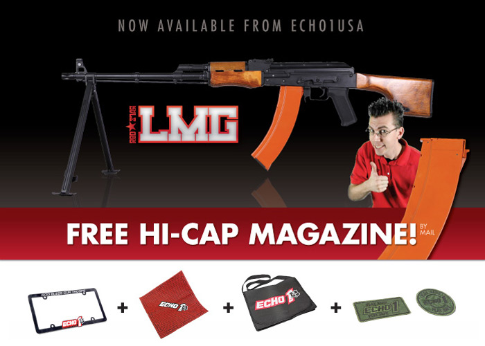 Be one of the first to get the RedStar LMG from Echo1 USA Airsoft to avail of some free goodies. Only limited to the first 100 customers... "The Echo1USA RedStar LMG is now available at your local authorized retailers. The LMG features steel and wood construction, making it the perfect support weapon.