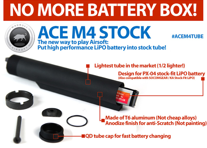 MadBull Airsoft just released a new M4 stock for you to stick in a Lipo Battery for those who want to use a rear-wired version 2 gearbox without worrying about cranestock batteries... "New way to play Airsoft: Put your battery into buttstock!