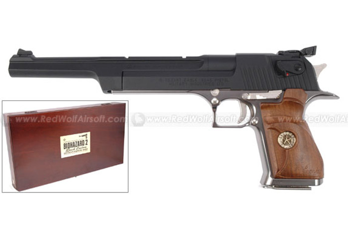 For collectors who are interested in this nice piece of airsoft handgun based on the Biohazard made in 1998. Costs US$525.00 at RedWolf Airsoft... "Used by Leon of the famous TV game - Biohazard 2, comes with real wood case.