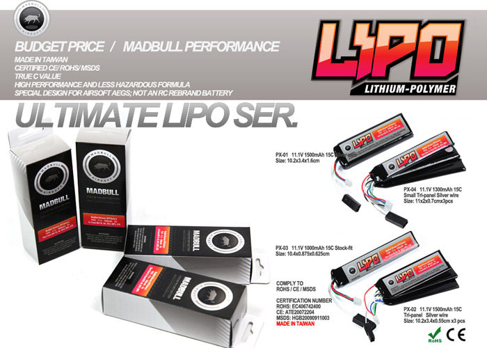 Reasonably priced "Budget" Lipoly Batteries coming from MadBull Airsoft will hit the retailers soon. These batteries may give you peace of mind as these already have some safety standard certification... "MadBull Ultimate PX Lipo Battery.