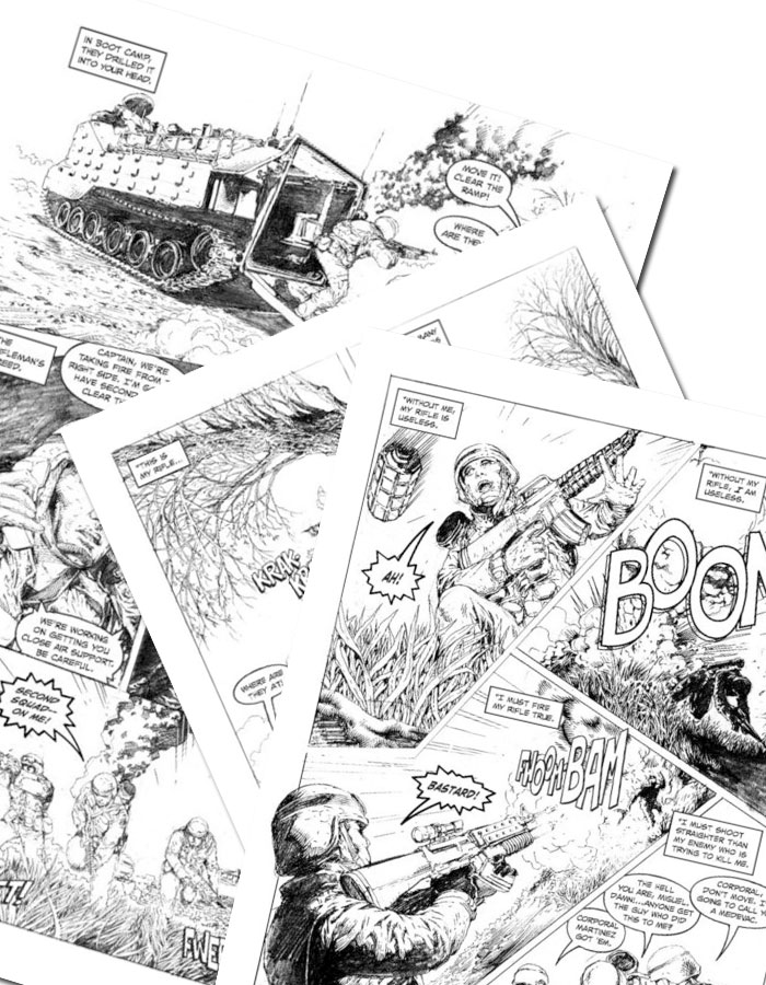 Determined to tell the story, Meyer released the "No Enemy, But Peace" in black and white in 2008 to rave reviews. But now, he wants to release a full color version of the Graphic Novel and has turned to Kickstarter to help fund the new project and time its release on the 10th anniversary of this battle which will be on the 12th of April 2013. Apart from having the color edition done and selling it online and at bookstores, he wants to get it into schools, museums, and libraries to further spread the story of Martinez and the rest of the Marines who fought with him on that day.