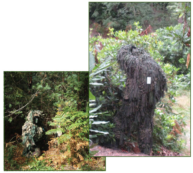 camouflaged clothing, as this already begins to break ones outline and blend him into the background. When wearing a ghillie suit, an airsoft sniper should complement his “attire” with suitable natural camouflage like leaves and twigs. He must also consistently check his camouflage to resemble what his surrounding looks like. A clump of “green shrubbery” on a leaf-covered ground does not make sense, does it? Bear in mind, that if crawling through varied terrains with different foliage density, an airsoft sniper should keep changing the foliage on his ghillie suit.