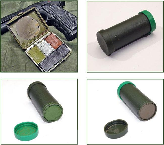 There are a number of items now available for camouflaging the skin, the most common and very popular among airsoft players are the military standard camouflage sticks, which come in loam, white, light green and sand. These camouflage sticks can be softened with an insect repellant spray for easy application. The Hunter’s Specialties camouflage makeup and grease are also good skin camouflage and consists mainly of dark colors. Stage or cinema makeup can also be a good alternative, especially when extreme skin tone “blending” is required.