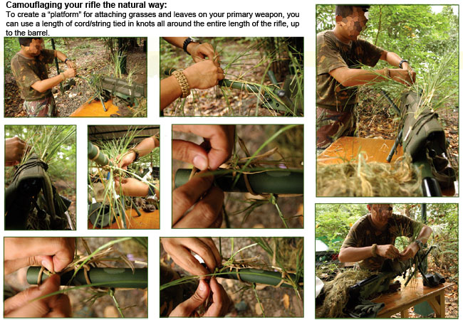 Grass used on the clothing is a must when moving through an area that is grassy. You have to be careful though in the use of grass on your clothing, as we sometimes have the tendency to apply it in long sheaths where shorter is better. Long grass on your uniform does two things—it sticks above the rest of the grass around you as you move through it, especially when you have to observe through the top of a grassy knoll (remember never look over anything if it can be avoided). The second problem with long sections of grass is that it creates a horizontal pattern when attached to your uniform, where vertical patterns are predominant in the natural world. Another thing to consider when using grass as camouflage material is that it has two tones—the “top” or upper side of the leaf is darker and shinier than the lower or “bottom” side of the leaf. A good airsoft sniper should be able to “present” the correct color according to his location.