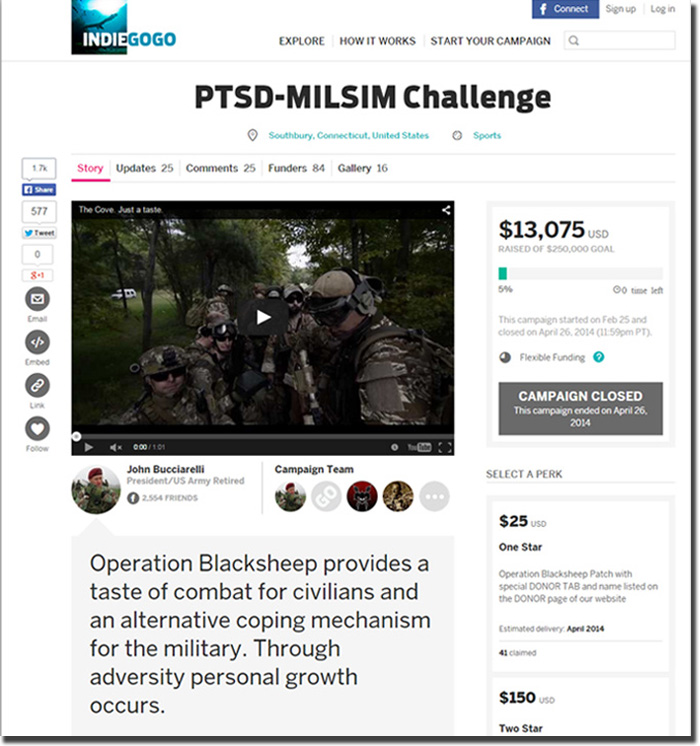 It was late one night when my phone rang and John was really excited. Over the next hour or so he outlined a plan that would have Blacksheep start a campaign that would collect funds for PTSD awareness. The general idea was that the Blacksheep events were already helping soldiers that had PTSD, and for the weekend they were with us, they felt better. A guy named John Fluckiger was working on a graduate thesis talking about his experiences with PTSD and Milsim and how it was helping him. This one paper was all John felt he needed as validation for what he wanted to do.