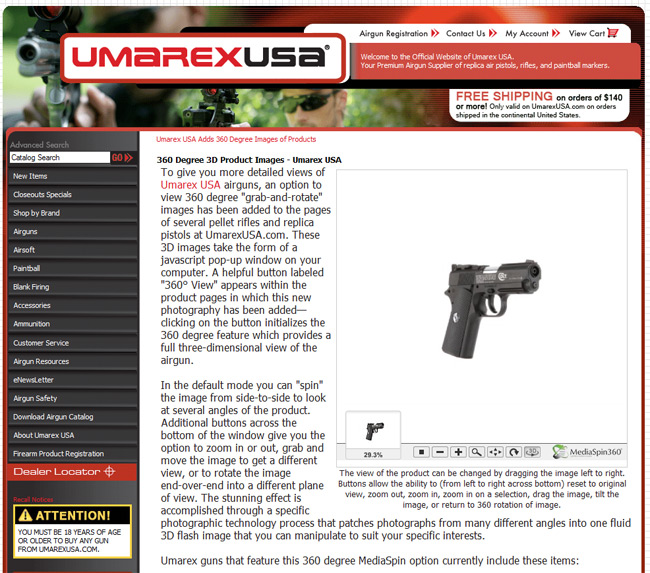 (I-Newswire) May 4, 2010 - FORT SMITH, ARKANSAS – (May 4, 2010) In an effort to give consumers a more detailed view of products, Umarex USA has added an option to view 360 degree "grab-and-rotate" images to the description pages of several pellet rifles and replica pistols at UmarexUSA.com. These 3D images take the form of a pop-up window which allows the user to view the airgun in all three dimensions.