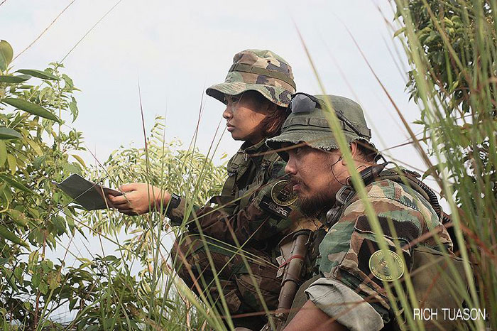 While on the way down, Trix saw a contingent moving and we quickly ducked into a nearby bushy area with trees above and around us. We had to stay perfectly still and keep our noise discipline as low as possible. Trix signalled to Aquila that she should move behind me to avoid any hits should a firefight ensue. Ink was trying to determine where we were on the map. I had my M16 SPR pointed down a pathway where I felt they would be coming.