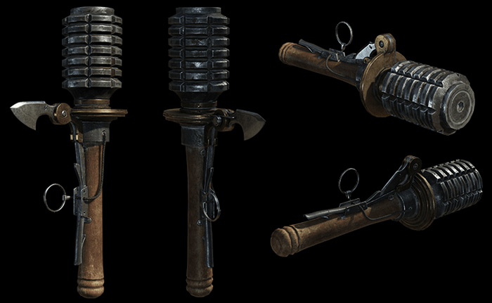 The Fragmentation Grenade looks like the Germand Grenades in World War II but can also serve another purpose --- being a stick-it mine that explodes if enemies are within its blast radius.