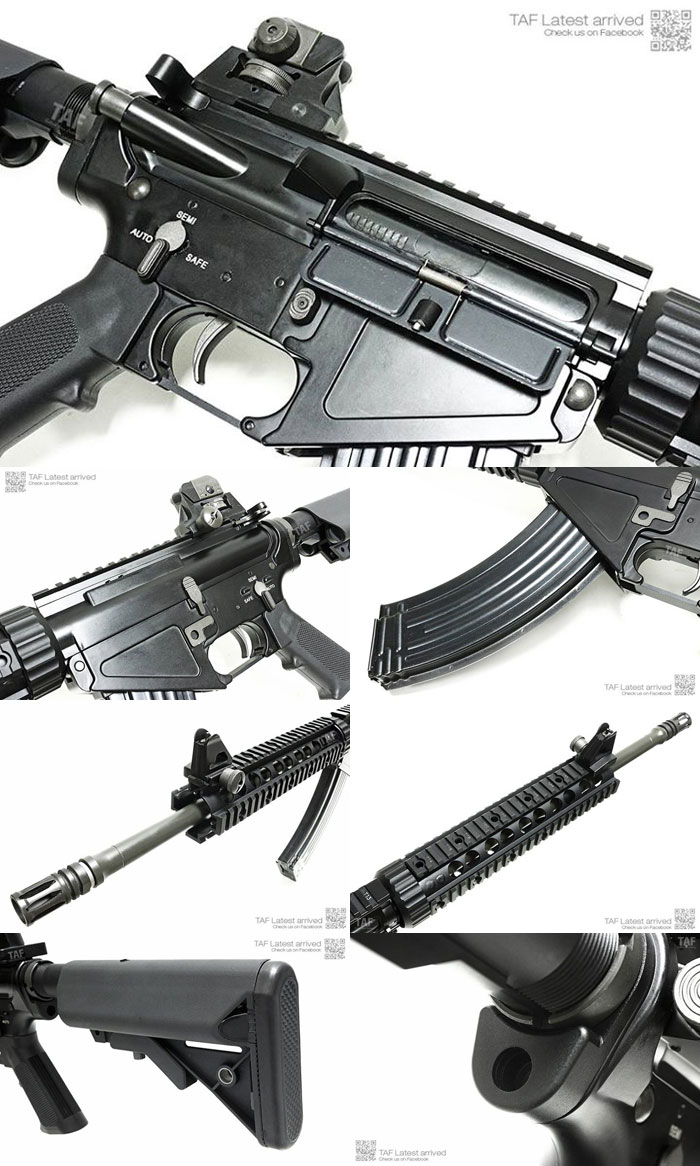 Basing on the photos uploaded by TAF, the BR-47 does not have markings, which is alright for us as we do not want the brand of an airsoft manufacturer etched on the receiver. The surface of the barrel is specially treated with the metal externals in forged steel. If our translation is correct the LMT-style buttstock is also a battery compartment, allowing you install cranestock batteries in their rather than using railed hanguard to insert a battery inside or use an dummy PEQ battery box. It also features an ambidextrous fire selector swtich.