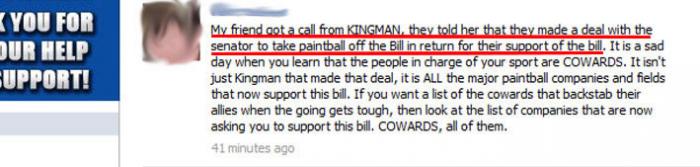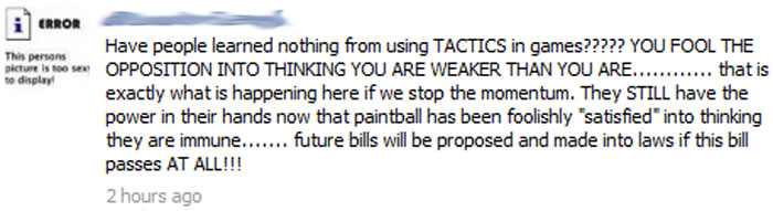 Stand your ground, let's defeat this bill! Invite paintball players wherever they are to help in the campaign.