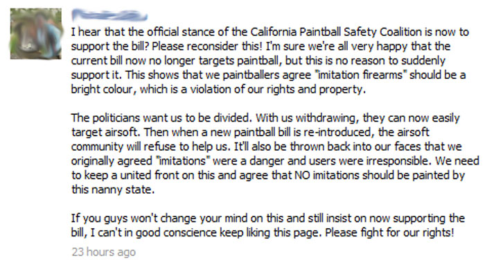 The good thing is that the Paintball industry's actual customers would have none of it. They are as shocked as the airsoft community for their industry in making such a deal when they believe that both communities are in this together. In contrast with the Paintball companies, the paintball players are taking a stand together with the airsoft community in opposing SB798 since they believe that even if it exempts paintball now, will they be assured that it won't be affected in the future? With the airsoft industry and community gone, who will help the paintball community campaign against bills similar to SB798 that will affect their sport in the future.? We have made screenshots taken from the Save Paintball in California Facebook page to save the postings of paintball players, in case the admin of the page deletes these: