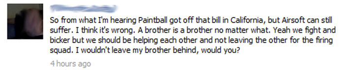 A collective disbelief has set unto the airsoft community and the California airsoft industry. People would accuse that the Paintball industry has sold out to the politicians to exempt paintball from the Bill in exchange for their support. Is it a good move? In a business sense, perhaps, since paintball is in direct competition against airsoft to cater to the recreational shooting and milsim market. Taking out airsoft would leave the big California recreational shooting and milsim market to themselves, which would be akin to selling out for 30 pieces of silver. This made a paintball player react strongly to the turn around by the Paintball industry (with unverified information) as shown by this post at the Facebook page of Save Paintball in California (Update: deleted by the admin of the FB page):