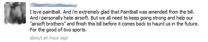 As of the time I submitted this post, the Save Paintball in California Page has not made any proper reply to their customers' reactions to their about face. It is a good sign that the paintball players themselves see that airsoft deserves to stay alive in California as compared to the Paintball industry. They are calling on paintball players to keep the fight alive, even if the industry has abandoned them and now support the bill.