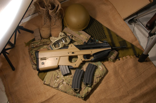 - I wanted to use a background that would complement the AEG, so I went for Multicam since the AEG is predominantly tan. I could also have used tan but Multicam introduces contrast between the background and foreground. Then I spruced it up some more by adding a few more accessories, like tan boots, goggles and helmet;