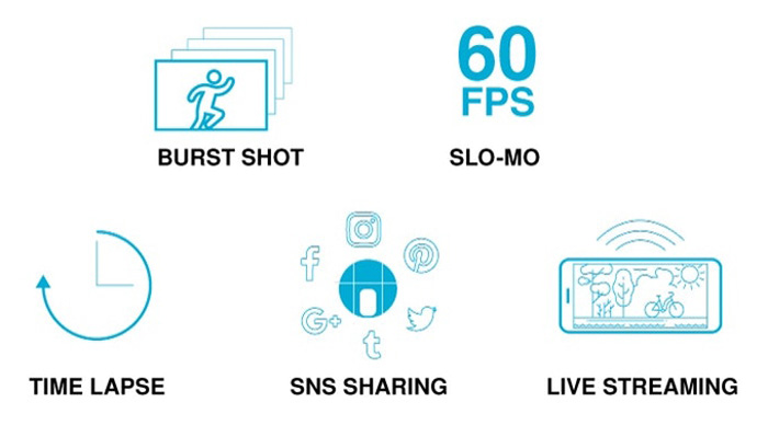 In Action Cam mode, it captures video at 60fps, does burst modes, time lapse, live streaming, and sharing it via social media.