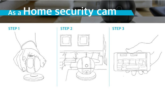 Once at home you can put it on its charging cradle and if placed in a strategic location in your house, can also act as security cam. It will be able to stream footage of your house via IP-Wifi via your mobile phone wherever you are.