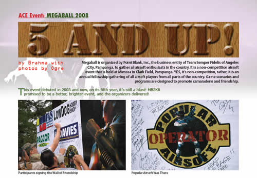 In our ACE Events section, our resident lay out artist tries his mettle at wordcrafting as he writes down his experiences at the 2008 Megaball held in Mimosa, Clark Field, Pampanga, Philippines, while Brahma and Ogre walks us through the many sideshows of the event. Moondog, again, amazes us with his stories on OP: Majestic. Brahma returns with a lowdown on the highlights of Battle of the Decades.