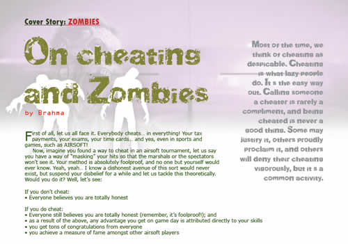 Airsoft “zombie-ism” is a loaded issue because we are all so close to doing it, if not already done it at one point or another. Please, do not argue with us on this, gentlemen -- you would cheat in two seconds flat if you know there is no chance of you getting caught. How do we know this? We know this because we have also thought about it, thought it through to the logical conclusion. So here we are on our 9th issue – ZOMBIES: what makes them tick and what do we do about it.