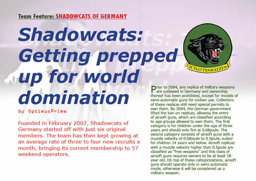 Brahma and Ogre, in their recent trip to the South (in the Philippines), led them to the discovery of this ass-kicking, BB-spewing team of sexy Valkyries – Team TAMSE of Malaybalay, Bukidnon. Be amazed at how this relatively young all-female team shows the ropes to the more veteran male teams in Busca y Destruir Tres, SEAL Davao’s 18-man CQB Tournament (appearing in our December issue). In Germany, OptimusPrime had the chance to “expose” Shadowcats’ plan of world domination.