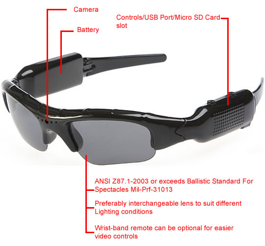 What I am proposing is to have a DVR eyewear that takes the hassle off in attaching another piece equipment on our bodies. The eyewear is also protective, and the convenience of putting a camera at eye level is better as there's no need to make adjustments to ensure that the camera is pointed in the proper direction. No need to look into a separate DVR LCD screen; no need for laser alignment tools; and no need to ask your mate to help you align the camera. Just put it on, and you're ready to shoot your video footage to upload to Youtube after the game.
