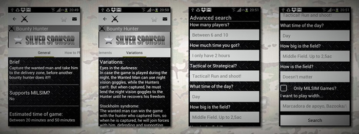 So, putting together some creativity, a little Internet and some programming, we developed the first Android app with a compilation of more than 100 airsoft games, most of them suitable for reduced number of players.