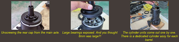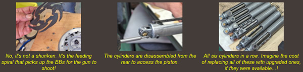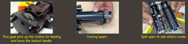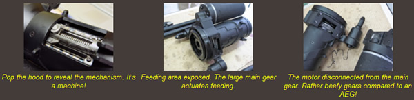 The operating principle is as realistic as they come: When the barrels are rotated by an electric motor, the main gear also actuates the feeding device. BBs are scooped into a helicoil feeding drum, and pushed into the main body in a single row. Within the main body there's a spiral-like disc that picks up one BB at a time and starts moving it into the chamber. By the time the BB reaches the chamber, the piston has been cocked by a cam surface on the inside of the main body, and is ready to release, firing the BB. Each barrel has its own cylinder and piston, so the loading and cocking process happens simultaneously in a different phase for each barrel.