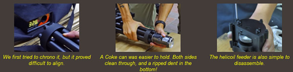 Shooting an airsoft Minigun is an experience even without BBs, but the internals made by CAW are even better than before. The M134 puts out BBs at 1.2-1.5 joules, which translates to around 350-400 fps. Aligning the barrel with a chrono and getting off several shots (to test each barrel group) proved to be difficult, as a BB hitting the front face of the chrono gives no reading at all, and if it hits the side or goes through the chrono at an angle the reading will be off. We then decided to break out the Coke can, even though the accuracy of this method is questionable as well. The Echo1 M134 Minigun was able to penetrate clean through both sides of the can, and made a deep dent with a clear rip to the bottom. The velocity is likely higher when the gun is shot with a battery, as rotating by hand eases the piston forward a bit before it's released. In our view the manufacturer stated 400 fps is a realistic approximate of the actual velocity. Together with an adjustable hop-up, the effective range is quite pleasing.