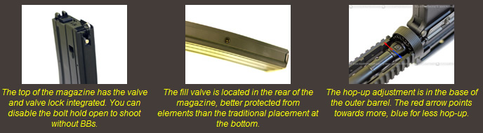 After years of coming behind Tokyo Marui in Hop-Up technology, Western Arms has finally made a major leap in this area. The hop-up features two pressure points for the BB to center it better in the chamber, and it provides a very consistent spin. On top of that, the hop-up is adjustable by a dial that holds the setting well, and provides tactile clicks when you turn it. With the carbine in your hands and the barrel pointing downrange, you can turn the dial without turning the weapon upside down. Adjustment towards the left RIS rail increases hop-up, while the direction of the right rail will decrease it.