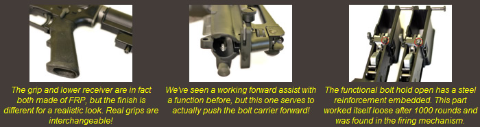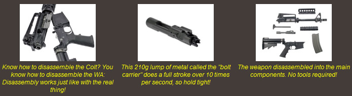 The WA M4A1 is a gas operated blowback rifle. The blowback principle is no different from the famous Magna Blowback of WA pistol series, but it is fitted to act as a heart of a larger weapon, so the components are larger and heavier as well. Gas and BBs are contained in the magazine, and the valve lock is also built into the magazine, following the tradition of Western Arms. The lower receiver has a firing mechanism that resembles the real M4A1 firing mechanism very closely, and functions with the exact same principle. The hammer spring is formed differently and it stops pushing the hammer before it physically hits the firing pin. This allows the firing pin to retreat after the hammer has been dry-fired (=decocked) so you can insert the magazine without damaging the firing pin and/or magazine valve.