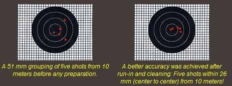 Despite the lack of volume of fire in one magazine, the WA M4A1 is definitely skirmish-worthy. The chrono readings were in the high 300's, which is at the top of the limit for most people's "comfort zone" in CQB, and actually useful even for woodland engagements. Colder climates will be a limitation, as is the case with all guns that use liquid charge propellants. The consistency proved excellent for a gas gun, which probably is due to the refined floating valve that controls the amount of gas used to shoot the BB. Consistent velocities together with a good hop-up system are the two most important things to make an airsoft gun accurate, and this carbine delivered both as you can see from the targets below. The shooting was done from a sitting position with the standard iron sights, using KSC 0.2g Perfect BBs and Green Gas.