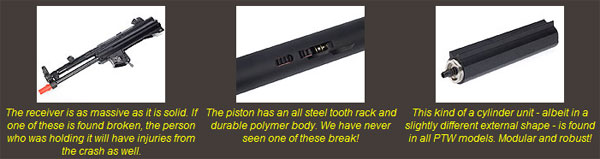 From the gears the energy is transfered to the piston. The entirely cylinder unit is actually similar to the unit we have come to love in the PTW M4/M16 series, just with a different shape on the outside to fit the PTW5 receiver. This means that the piston body size is reduced along with the spring (and spring guide) size, to allow more room for a stronger tooth rack. The tooth rack is all steel made, and sits securely in a captive slot on the underside of the polymer piston. The piston body is solid all the way around, so it is stronger than traditional AEG pistons with an all metal tooth rack.