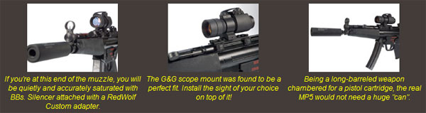 Despite being a new model, the markets are already saturated with accessories to "tacticalize" your PTW5. Thanks to the real dimensions, most real steel accessories will be a direct fit. The muzzle is attached to the outer barrel with a thread, and a threaded part to attach a silencer will be available from RedWolf as soon as the PTW5 is officially released. To attach any scope on the weapon, we found that the G&G L.P.M for G3/MP5 Series [G-03-031] was a direct fit to the PTW5 with zero modifications!