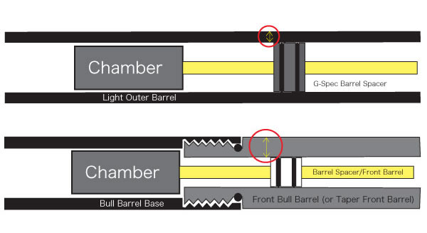 Noticeable in the Taper Front Barrel series is how the front end’s inner diameter varies from its rear end—the front end is 23.2mm in diameter, while the rear is 30.5mm. This “tapered” design of the barrel’s inner diameter makes it front-heavy like the Front Bull Barrel series, for the same balancing effect, necessary to accomplish steady and accurate shots.