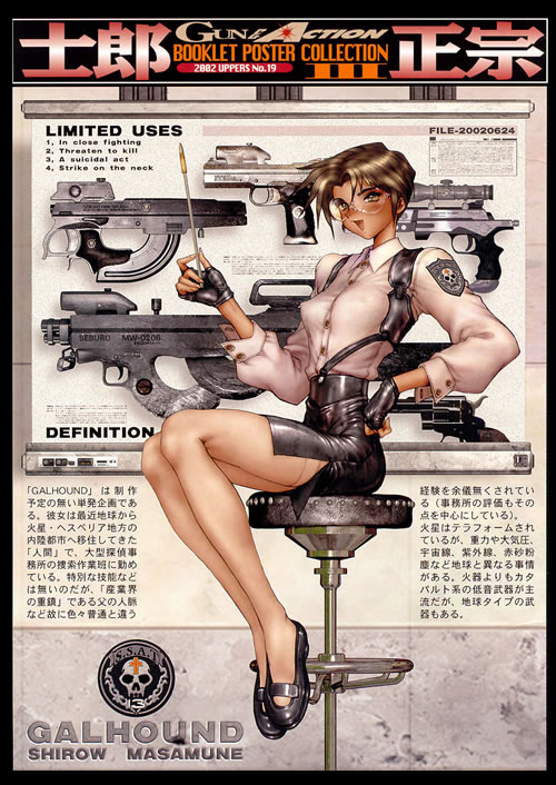 - Gover- A 10 mm semiautomatic handgun primarily based on a Browning designed M1911 frame. It features a ported compensator for recoil reduction and quick recovery time. Despite its centuries-old mechanism and its chambering in pistol ammunition, it is quite capable of neutralizing cyborgs and Landmates. (Appleseed)