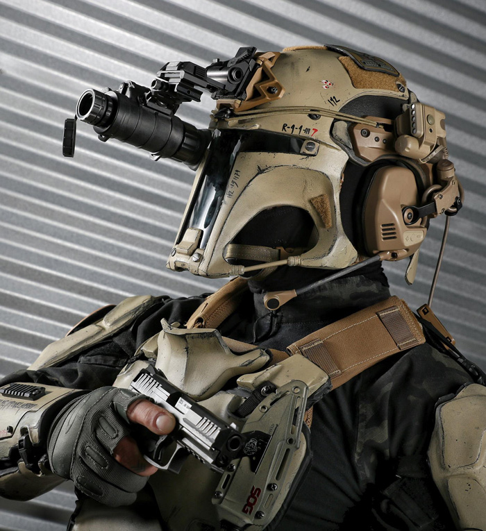 Whilst Flowers brough the Boba Fett look to contemporary use, albeit in a non-armour form, nevertheless he attracted the interest of some of the big names in the firearms and tactical accessories industry. Teaming up with AR500 Armor, Heckler & Koch, SOG Knives & Tools, SureFire, LLC, Team Wendy, Armasight, Inc., Wilcox Industries Corp., and TEA Headsets, he has released a ballistic armour version of his work.